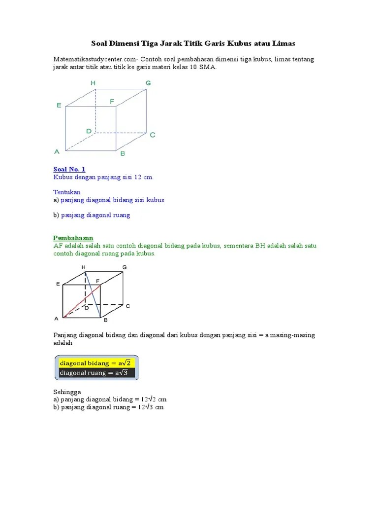 kubus memiliki 12 rusuk yang sama panjang; diagonal bidang dan bidang diagonal tentu berbeda. Namun, terkadang anda diminta untuk mencari diagonal berdasarkan nilai yang lain, misalnya keliling atau luas persegi. Dan dua titik sudut ini letaknya saling berhadapan di dalam ruang berdiri kubus. Jadi , kubus terdiri dari enam buah sisi yang membentuk prsegi yang luas setiap sisinya :